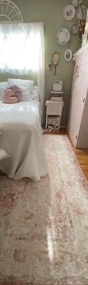 I had given up looking for a light colored rug for my room but ordered this for The attached indoor patio. After receiving this I was so in love with it, I put it in my room instead. The colors are just what I wanted, beautifully soft, feminine & has that timeworn look. It was also great that ends didn't stay curled when I unrolled it& it feels silky soft. Will definitely order again.