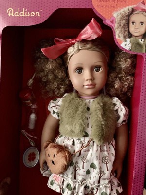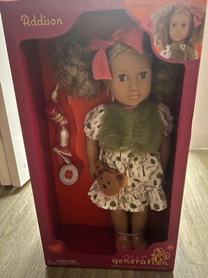 [This review was collected as part of a promotion.] Our Generation Addison 18'' Fashion Doll Goldilocks-Inspired Outfit & Accessories is so adorable. Addison has lifelike hazel eyes that open and close with curly blonde hair that's fun to style in many ways. Clothing has easy-open closures to quickly put on and remove. She has a huggable soft body with a movable head, arms, and legs. My daughter plays all day with this doll and changes its clothes. She brushes her hair also.