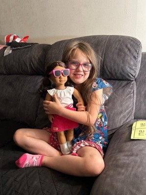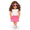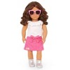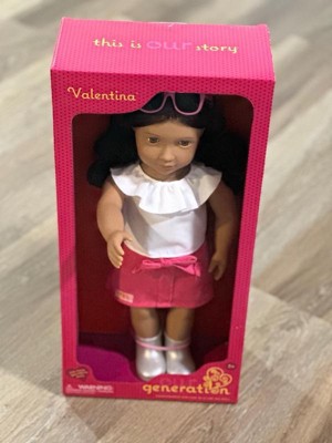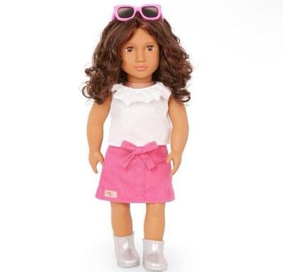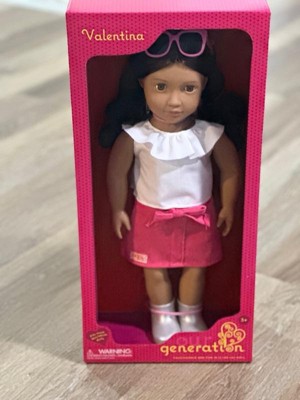 Explore sweet styles and fashion fun with Valentina! This Our Generation 18-inch doll has a huggable soft body and lifelike features to delight doll fans during playtime. Her beautiful brown eyes open and close, and her wavy, dark-brown hair is fun to style in many ways! Valentina wears a pink bowknot skirt, a top with a ruffle collar, a pair of booties, and bright pink sunglasses for extra pop. When it's time for dress-up, her outfit has easy-open closures to quickly put on and remove. So you can mix, match, and create more stylish looks on any adventure! Our Generation dolls make a great gift for kids ages 3+ (small parts), encouraging them to imagine their own unique stories.