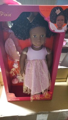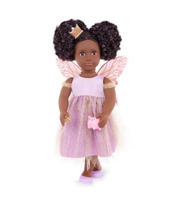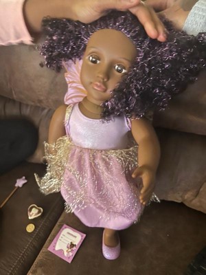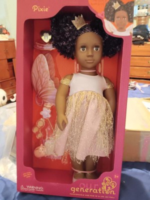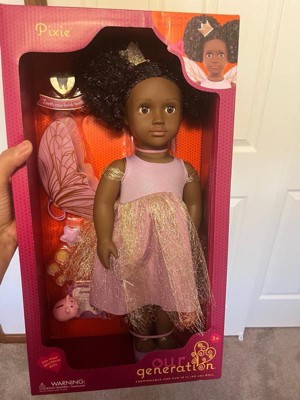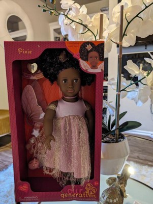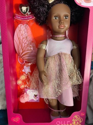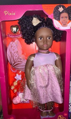 [This review was collected as part of a promotion.] This is the best for your kiddos to change and have fun with as they go through different phases & milestones Dream up magical stories with Tooth Fairy Pixie! The Our Generation 18-inch doll” has dark-brown eyes that open and close, and her curly black hair has bright purple streaks to make every style shine! Did someone lose their baby tooth? Yay! Fill out the tooth certificate to celebrate. Then place it in Pixie's tooth fairy box for safekeeping. It really holds a child's lost tooth so both dolls and kids can enjoy fairy tale fun together! Pixie arrives wearing an enchanting fairy dress with a golden shimmer overlay. Plus, she comes with signature accessories like fairy wings, a star wand, a crown, a piggy bank, and 3 coins to collect her tiny treasure. When it's time for dress-up, her outfit has easy-open closures to quickly put on and remove. So you can mix, match, and create more stylish looks on any adventure! Our Generation dolls make a great gift for kids ages 3+ (small parts), encouraging them to imagine their own unique stories. • 18-inch Tooth Fairy Doll: Dream up magical stories with Our Generation 18-inch doll Pixie! • Detailed Features: Pixie has lifelike brown eyes that open and close, and her curly black hair has bright purple streaks to make every style shine! • Easy to Play: She has a huggable soft body with a movable head, arms, and legs for kids to easily change her outfit during dress-up. • Real Tooth Fairy Box: Kids can place their lost tooth inside Pixie's tooth fairy box for safekeeping until she pays a visit. • Includes: 18-inch doll, fairy dress with a golden shimmer overlay, fairy wings, a sparkly crown, a pair of undies, shoes, a tooth fairy box, a star wand, a lost tooth certificate, a piggy bank and 3 coins that fit inside. • Mix & Match: Clothing has easy-open closures to quickly put on and remove as kids explore storytelling and self-expression. Compatible with most 18-inch dolls, doll clothes, and accessories. • Recommended Age: Our Generation dolls make a great gift for kids ages 3 years old and up (small parts), encouraging them to create their own unique stories. You can always change the doll to different clothes sold at target for different stories and imaginative stories and play time! It’s the best bang for your buck with all the accessories that are included plus add ons!