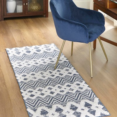 [This review was collected as part of a promotion.] I love the deep blue color and design of the rug. This has added so much style to my living room. I also love that it is reversible even though i am very careful with keeping it clean it is great to know that i can flip it over if i ever do get a stain that does not come out. I have added a rug pad as suggested as it did move around on the hard wood floors without it.