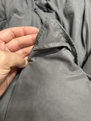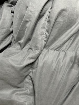 The comforter is beyond comfortable! It came in a sealed package and within an hour of opening it, the comforter fluffed right up. Or you can put in the dryer to fluff more. The gray is just as displayed on website. Nice, thick and warm blanket. It matches any bedroom decor with the dark color. You can add pillows for more pop. The sewing on the comforter is well done and this is all well made. It keeps me quite warm in the Winter. All the squares are even and keeps the insides where they need to be