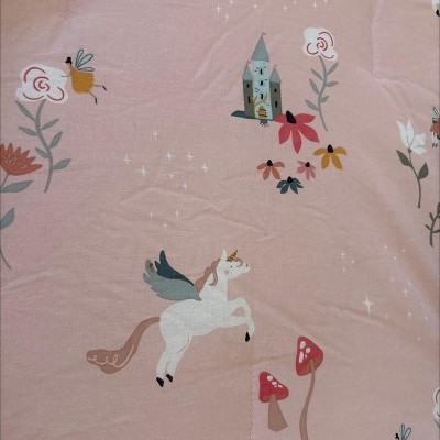 • A: The comforter set features colorful pegasus, fairies, castles, and floral graphics.