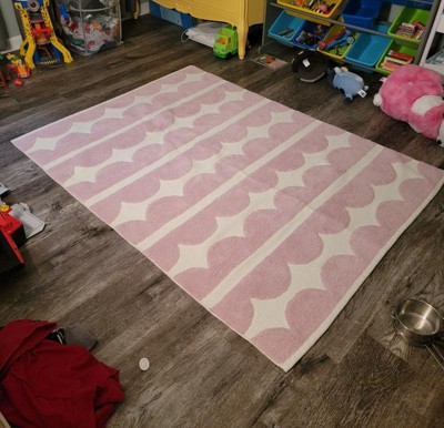 Such a cute rug! My daughter has really enjoyed having this in her room, it adds some color and variety. It’s also very neat, the spots that are white are a thinner material and the pinkish spots are raised like a typical rug. It’s a very simple pattern compared to some rugs that tend to be busy so it was a win in our book. Sometimes it does get slightly scrunched up after walking on and movement but a quick tug and it flattens back out. It’s stayed clean for us even having pets in our house.