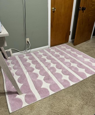 Enliven your child's room decor with this Scallop Rug from Pillowfort™. Made from 100% cotton and featuring a tufted design with a medium pile height, this printed area rug feels soft and cozy underfoot. Plus, you can toss it in the washing machine for easy cleanup whenever needed. Showcasing a scalloped print in purple and cream hues, this indoor rug is sure to add sweet flair to their space.