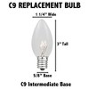 Novelty Lights 25 Pack of vintage traditional ceramic C9 Christmas Light replacement bulbs have bright and vibrant coloring that will provide years of use for your Christmas light display. These 7-watt, 120-volt bulbs with an E17 intermediate base will shine for 3,000 hours and have nickel-coated bases to prevent corrosion. These C9 replacement lamps can be used inside or outside to decorate roof lines, patios, and walkways. Each bulb has a intermediate base (e17) 3" tall and 1 1/4" wide. These bulbs screw into our C9 Stringers (25' & 100'), our E17 Heavy Duty Light Strings (25', 100' & 330'), our commercial grade bulk 1000' C9 spools as well as our vintage Twisted Wire Strings with E17 Bakelite Sockets.