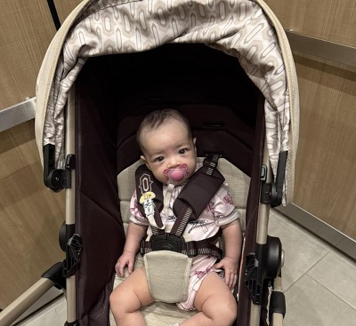 - Stroller has secure and comfortable 5-point harness with plush fabrics