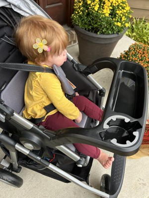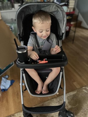 - Full-sized child tray with cup holder that fits all sizes of sippy cups