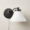 Add convenient lighting wherever you need it with the Reeded Milk Glass Wall Sconce Hearth & Hand™ with Magnolia. Made with metal, this black wall sconce features a reeded white milk glass cone shade for a modern look that works well with a variety of existing decor. The sconce comes with a socket turn knob rotary switch and a fabric-covered cord so you can place it by any outlet to add beautiful illumination to your space.