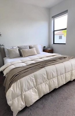 The duvet filling is 80% goose feather fiber, 15% goose feather and 5% down fiber, with an extra step to remove solid feather quils, providing plushness and softness, and year-round warmth. Designed with sewn-through box construction, it ensures uniform distribution of the duvet filling, and prevents filling from shifting or bunching. The comforter duvet insert can be anchored to a duvet cover by its 8 reinforced corner and side tabs keep your comforter in place, also can be used as a duvet insert or as a stand-alone comforter.
