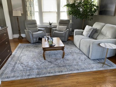 Love this rug that I purchased for my laundry room. Needed a little something to spruce up area in front of the washer and dryer. This 2'6" x 4'6" size fit perfectly! It's soft and and looks very pretty. I like the nice subtle colors of grey and blue.