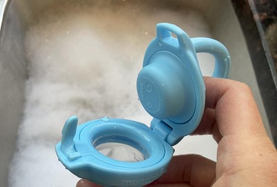 Waste of money. I couldn’t even open it to clean before use. One of the tabs broke immediately without much force at all. I simply cannot even get the other open at all! It is one piece with a ridge around the bottom which would be hard to clean and only has one small hole that lets liquid out. There are much better brands out there.