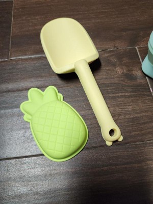 Cute sand bucket, shovel and pineapple shape. Love that it is collapsible and can be brought with for traveling. However, the shovel does not work well and bends easily. My children are not able to collapse the sand bucket on their own very well. Silicone material is nice but can only stand up to perfect sand or environments. Works okay in dry ocean sand but does not work well in wet sand or lake sand (more imperfect sand environment).