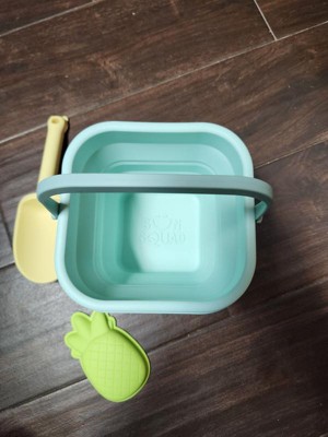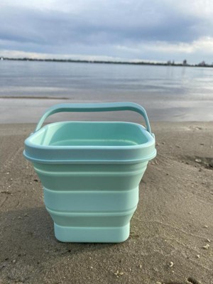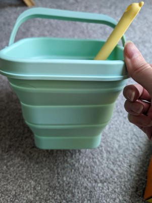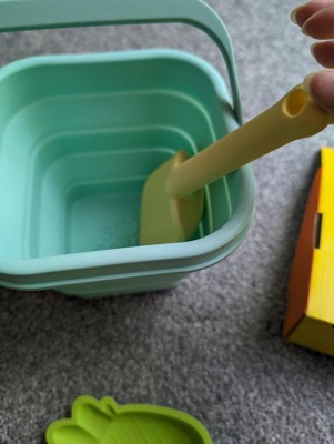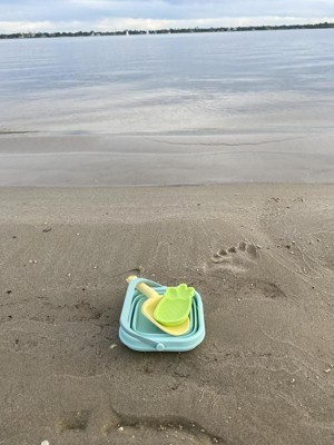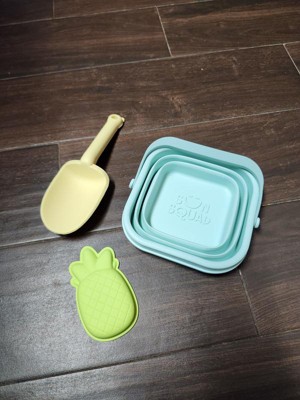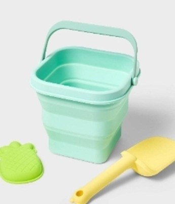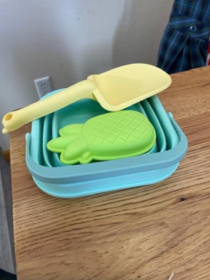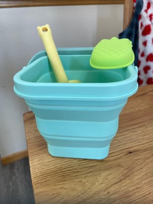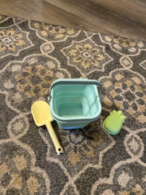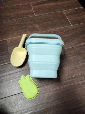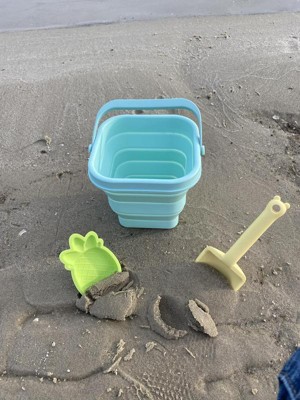 Finally a pail that is easy to transport. We live a few hours from the beach and I hate having to transport all the pails and beach toys, especially once they are full of sand. We are excited to take this soon. It folds down really small and is easily packed in the beach bag. Dirt rinses really easy off the pail which is a plus. The shovel and pineapple mold are also silicone and feel like they will hold up much longer than the traditional plastic beach toys. So excited for the next beach trip to use these on real sand!
