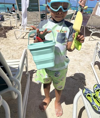 This bucket and shovel set was perfect for our cruise. We were able to pack it in our suitcase while traveling and it didn’t take up too much space. Once reaching the beach the kids played with it and loved having something to transport water to their sand castle. The only con was the shovel being a bit too flexible while scoop hard sand. Other than that we had a blast using it and plan to bring it on our future trips.