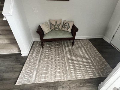 Gorgeous! This rug is stunning! I just love the pattern. It’s so unique. I’d planned to use it inside, but the pattern really begs for an outside space, but I have it outside on the patio for now. It’s a gorgeous cream/taupe shade with a geometric pattern I love. I get tons of compliments. I highly recommend this rug if you’re looking for something different and yet neutral for your decor.