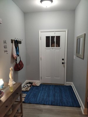 I bought a 4'x6' rug for my entryway. I couldn't find a washable indoor rug to match my rug the shoes are on...so I decided to put just a full rug at the front door. It really opened up the space. So glad I can vacuum and wash it.