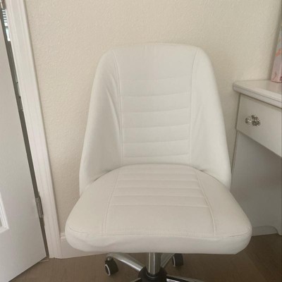If you’re in search of a small desk chair that doesn’t compromise on style, our armless mid-back home office chair is an excellent option. The combination of deluxe faux leather upholstery, recessed arms and chrome-accented frame will lend a touch of class to your room. A durable steady frame makes sure our customers enjoy a comfortable and relaxing sitting experience. The foam-padded seat and subtly curved backrest give excellent body support while relieving muscle stress caused by long hours of working, applying makeup, or studying. Adjust the seat height to your personal preference and activate the rocking mode when you need a break from your workload. Plus, the PU castors provide 360° smooth mobility without scratching the floor. This office task chair is a nice-looking addition to a range of spaces, including study rooms, home offices, bedrooms, apartments, reception areas, meeting rooms, and more.
