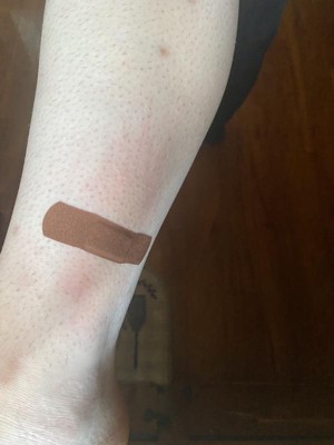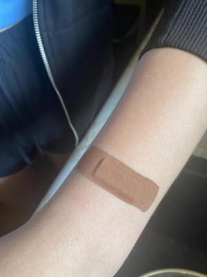 These Skin Tone Assorted Size Flexible Bandages - Brown are way darker in color then expected. My husband who has a darker tan couldn't camouflage these bandages. Not a deal breaker though since they do serve there purpose and there is a nice quantity per box and in different size to any size of cut or scrap you may need. These do stick well, all most too well when around the finger and they overlap. You almost have to cut it off. All around a good quality bandage to keep your wound clean.