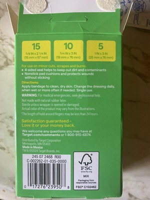 This is a set of flexible, assorted fabric bandages. They are made in 3 different sizes and are individually wrapped. It is a great idea to make them matching skin tone. The bandage is well-made and has a 4-sided seal. It holds very well and is perfect for minor cuts.