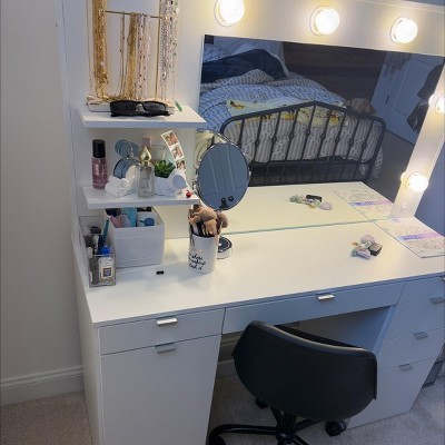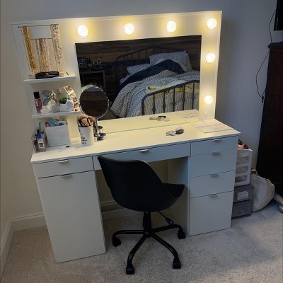 [This review was collected as part of a promotion.] This vanity is gorgeous, I have wanted one all my life and it definitely lives up to what I thought it would be. It was a little difficult to put together as not all the pieces were marked properly and it was became a guessing game.It took a lot longer to put together than it should have. However, when everything was said and done, this vanity is gorgeous! It was definitely worth the extra time and effort. The storage space is awesome and it has plenty of space for everything I want to put in it. Having everything at arms reach is super important to me. The quality is great and the lighting is perfect. Having 6 lights ensures I have enough illumination to do my makeup, hair etc. Light bulbs are not included. I strongly recommend this vanity. It’s great quality and is exactly what I wanted.