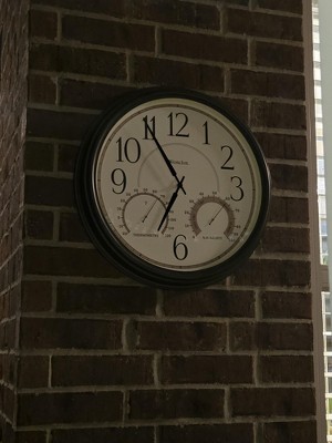 This is advertised as an outdoor clock. Here's my timeline: opened the box and took the clock outside on a Friday to gauge placement on the wall. I left it outside that evening to hang it the next morning. Saturday morning I found the clock was 80% fogged over with humidity. Mind you...we had no rain. Just a hot/humid midwest summer night. I hung the clock and thought it may resolve itself. Nope. In addition, the temperature was off by roughly 15 degrees and the humidity was reading 'dry' at 40%. Obviously not, since it was fogged over like crazy (weather app said 70% humidity). I removed it and took it inside to dry out before packing it to return. Today is Monday and after two days in our A/C temperature-controlled house, the glass is still fogged/dripping condensation. Horrible product.