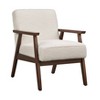 Cozy up in your favorite chair to watch movies, read your favorite books or simply relax with the comfortable Sonia chair. Featuring white upholstered boucle fabric and a rich walnut finish, this piece exudes mid-century design to complement vintage and classic furnishings along with a rugged rubberwood frame that is pleasingly durable for everyday use.
