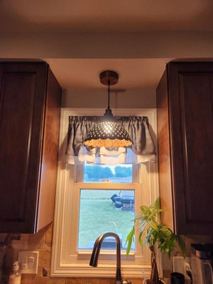 [This review was collected as part of a promotion.] Absolutely beautiful light can go with any decor the punch hole on the shade reflects off the room and walls giving your room amazing lighting easy to install can be hung inside or out with covered patio the color is pretty gives off a rustic look yet country style definitely recommend for any room in your home