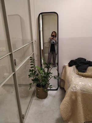 I purchased this mirror for my son’s dorm room. I love the design of the black rubber frame and it’s functionality. The mirror leans easily against a concrete wall. Also, the height of the mirror is a perfect full length for tall people.