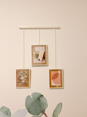 We are using this in our playroom to display artwork and it is so cute! Perfect for a small curated display of my sons’ favorite artwork. Frames are metal and glass and the entire thing feels sturdy and high end. Super easy to remove the frames from the wall and swap out the art. Can also change the layout and orientation of the frames along the bar for a different look.