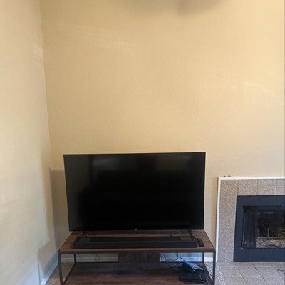 Get ready for family movie night with the RealRooms Fayette TV Stand. This ultra-modern TV stand can hold most TVs up to 65" wide or up to 120 lbs. This modern industrial TV stand will give you everything you need to sit down, relax, and binge watch your favorite Netflix series. The minimalistic design is perfect smaller spaces. Add to your living room or man-cave for a high-end look. The open back is allows you all the access you need to outlets and wires when trying plug in your components. The distressed woodgrain finish on the laminated particleboard looks gorgeous with the sturdy metal frame. The TV stand ships flat to your door and 2 adults are recommended to assemble. The TV stand can support up to 120 lbs. The lower shelf can hold up to 100 lbs. Assembled dimensions: 17.87"H x 59.92"W x 20.43"D