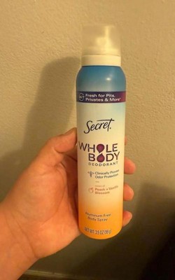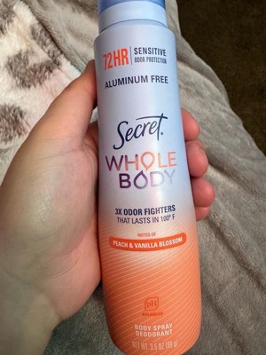 😍Obsessed! Thank you for your review of Secret Aluminum Free Whole Body Spray Peach & Vanilla🍑