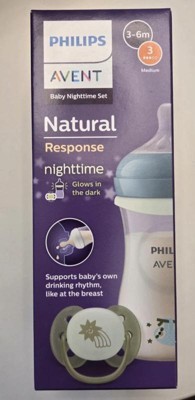 A perfect starter set for new parents. Philips Avent Natural bottles with Natural Response nipple lets baby control the pace of the milk, like they do when breastfeeding. The nipples' unique opening and tip only releases milk when your baby actively drinks. When pausing to swallow and breathe no milk flows. Baby can drink, swallow, and breathe using their natural rhythm, just like they do when breastfeeding. Easily combine breast and bottle feeding with a wide breast-shaped nipple with a soft feel that mimics the shape and feel of a breast; plus baby controls the flow of milk. The bottle brush has a curved brush head for easy cleaning of rounded bottle edges and a molded tip to clean the nipple. Sealing discs convert any Philips Avent bottle into a storage container. Soothie is used by medical professionals to calm newborns. The highly durable Soothie Pacifiers feature hospital grade silicone and one-piece construction. The Natural bottle is made from polypropylene, a BPA free material, and works with all nipples and caps from the Natural line. The Natural response nipples come in flow rates 1-5, to keep up with your baby's growth. Includes: 2 4oz Natural bottles with Natural response nipples flow 2, 3 9oz Natural bottles with Natural response nipples flow 3, 3 Natural Response nipple, flow 2, 3 Natural Response nipple, flow 3, 2 Soothie pacifiers 0-3 months, 1 bottle brush, 3 sealing discs. SCD838/31. What to expect when introducing the Philips Avent Natural Response Nipple It is totally natural for your baby to take 2-3 tries to get milk flowing from a new bottle. Unlike traditional bottles the Natural bottle is designed to only release milk when your baby is actively drinking, like what happens when babies breastfeed. We have 5 different nipple flow rates for the Natural bottle. When looking for the right nipple flow rate, age is a guide, but your baby's approach to drinking and the feeding cues they will show will help determine when to move to a higher or lower nipple flow rate.