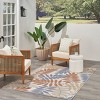 This rug is beautiful on my pool deck. With neutral chairs and neutral table this really brightens up the space. Directions for cleaning say just hose it down. Couldn't be easier.