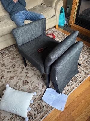 Lacked pre-drilled holes as indicated in the instructions so couldn't put it together. Fabric definitely shows marks when you touch it - like it has one look when brushed with the grain and a darker color when brushed against the grain. Fabric is very soft. Liked the look of the chair but don't know how it sits. Legs had dents.