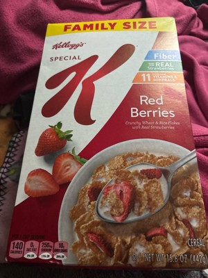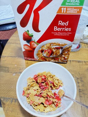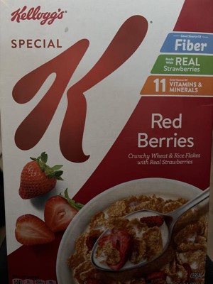 Start your day off right with the simple goodness of Kellogg's Special K Red Berries cereal, a deliciously crafted, wholesome cereal that loves you back with each healthy spoonful. This filling cereal is bursting with real strawberries and made with lightly sweetened rice and wheat flakes to energize you for the day ahead. Just as nutritious as it is delicious, this breakfast cereal is made with whole grain, is a good source of fiber and 11 vitamins and minerals to help keep you going strong; Take a deliciously satisfying meal or snack with you wherever you go. Whether you enjoy your cereal at home, work, school or the gym, you'll love the sweet and satisfying taste. Go ahead, pop open the box, pour over your favorite milk, and enjoy Kellogg's Special K Red Berries cereal that lets you feed your strength with each irresistible bite.