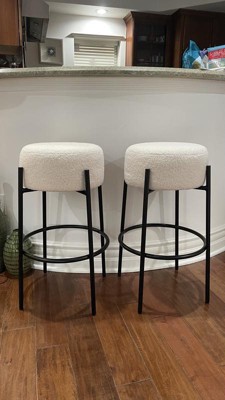 Isaac padded bar stool features a soft padded seat covered in our gorgeous and on-trend boucle fabric. Isaac is the perfect combination of form and function. The contrasting black metal frame with built in footrest keeps your legs comfortable as you sip on that end-of-day rosé. The 29 inch bar stool means it will fit perfectly in your bar or kitchen island. And with a 15 minute assembly time, your kitchen will gorgeous in no time, with almost no effort! We love that for you.