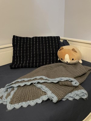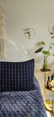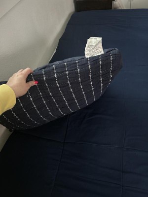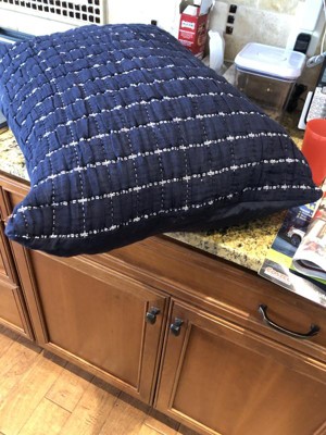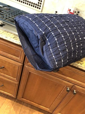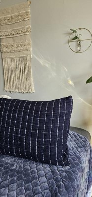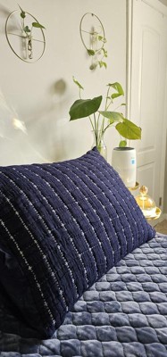 Navy blue pillow sham with great details—crinkle grid design with standout white yarn. Soft touch and comfortable feel. Crinkling is a cute detail that gives depth to a room. The navy blue color is great for a nautical, ocean theme.