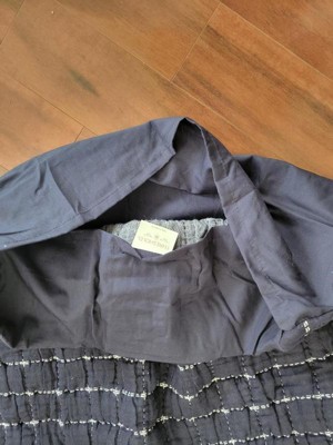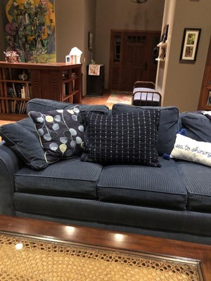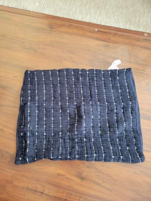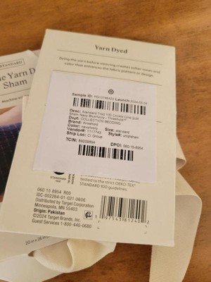This is another great quality Threshold bedding item. It's yarn dyed, and slightly nubby. The ivory looks bright against the navy and the sham washed and dried perfectly. I used a color catcher in the wash, but the dye didn't run. This is very soft with a sort of upscale homey feel. I love that it's an Oko Tex item and that the packaging is minimal. The navy works well with ivory & other solid colors, especially red and some paler blues. The texture adds some softness and visual interest. It's versatile enough to work in neutral, masculine or feminine settings. I didn't see any loose threads or crooked seams, and there's a flap to tuck over the pillow to keep it on securely. The shame doesn't have "stiff" edges but it isn't sloppy looking. It is very well made.