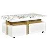 - [Moderate Luxury] This coffee table is an upgrade of modern elegance, with its faux marble tabletop that offers a sleek surface for displaying decor and serving drinks. The gold metal bars embedded in the panels also add a touch of glamour and luxury.