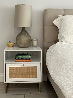 Nathan James 22" Mina Rattan and Wood Nightstand Matte White/Gold: Enclosed Storage