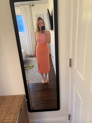 [This review was collected as part of a promotion.] This dress is gorgeous! I wore to a beach wedding rehearsal and got so many compliments. It fits snug so I sized up after reading other reviews and am glad I did. The only downside in sizing up is that the top was a little loose on me, but my chest is a little small. I was hoping to wear without a bra but wearing a strapless bra helped it fit better. It’s very flattering, especially the diagonal color block. Highly recommend!