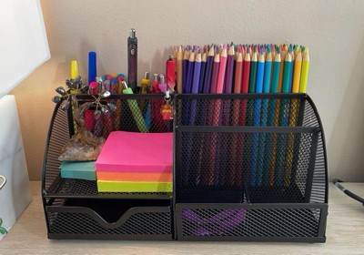 [This review was collected as part of a promotion.] I needed an organizer for my desk and this is perfect. I like that it’s got a lot of compartments for me to be able to store several different items; and they’re different sizes as well. So far I’ve organized my pens and colored pencils. And arranged my sticky notes. I just moved into my office so I will be adding more things to it. It’s very handy, and doesn’t take up too much room but does fit a lot in it!