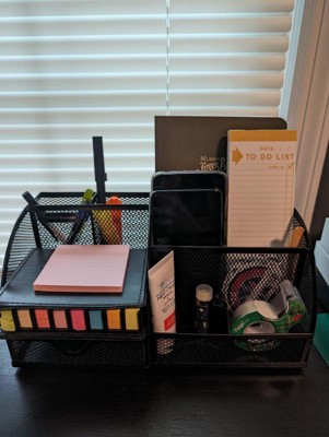 [This review was collected as part of a promotion.] I absolutely love this organizer. I have a small desk that I work from home part-time at and it never seems to be organized. I've always had a cluttered desk and since I started working more from home I decided that I needed to change that. Seeing this organizer I thought that it would be the perfect fit and I was right. It doesn't take up too much of my space and fits perfectly next to my computer, but so much fits into it. I used to have to dig through every single drawer I had to try and find my sticky notes or paper clips or a push pin and now all of its right in front of me including my important papers and my phone and my calculator. If you are trying to organize I cannot recommend this enough it's made a huge difference in my efficiency.