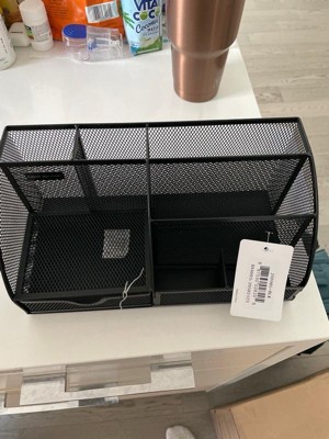 [This review was collected as part of a promotion.] The Desktop Organizer in sleek black metal mesh design, measuring 11" L x 5.5" W x 5" H, proves to be an indispensable addition to any workspace or office setting. Its multifunctional design seamlessly combines file storage and accessory organization, offering an efficient solution to declutter and streamline the work environment. The metal mesh construction not only adds a contemporary and professional touch but also ensures durability and longevity. The sturdiness of the organizer provides confidence in its ability to withstand the demands of daily use, making it a reliable choice for maintaining a tidy and well-organized desk. The compact yet spacious dimensions cater to various needs, accommodating files, documents, and small accessories without occupying excessive space. The thoughtful layout includes different compartments, allowing for systematic organization. The file storage section is ideal for keeping important documents within arm's reach, promoting a more efficient workflow. The accessory storage compartments are versatile, providing designated spaces for pens, notepads, sticky notes, or any other small items that tend to clutter desks. This feature contributes to a more organized and visually pleasing workspace, enhancing overall productivity. The sleek black finish not only adds a touch of sophistication but also ensures compatibility with a variety of office aesthetics. Its neutral color allows it to seamlessly integrate into different decor styles, making it a versatile choice for various office settings. Assembly is typically straightforward, and the sturdy construction guarantees a stable and reliable desktop organizer once set up. The 11" L x 5.5" W x 5" H dimensions strike a harmonious balance between providing ample storage and maintaining a manageable footprint on the desk. In conclusion, the Desktop Organizer in black metal mesh combines practicality with aesthetics, offering a durable and efficient solution for file storage and accessory organization in any office or workspace. Its thoughtful design and versatile compartments make it a valuable asset in promoting a clutter-free and well-structured work environment.