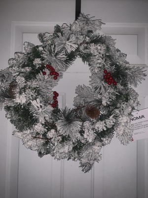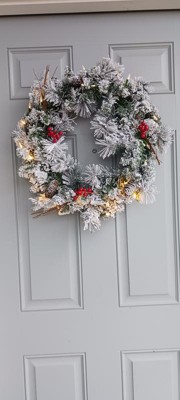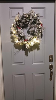 NOMA 24 Inch Pre-Lit LED Flocked Berry Christmas Wreath Holiday Decor with Battery-Operated Lights, 35 Warm White Bulbs, 160 Pine Tips