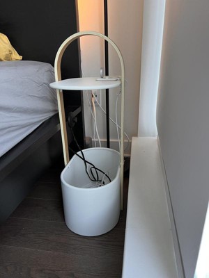 I bought this for a small bedroom which needed a very narrow sidetable to accommodate the door opening. It has made the bedroom much more practical as it can accommodate a lamp, enabling someone in bed to turn on the light easily, as well as books in the lower storage basket. Although I have other Umbra products, I bought this due to its size. For something so narrow, it is really stable, probably due to the handle, so there is no danger of the lamp falling. It has been so useful that I bought one for a relative whose child's bedroom has the same space issue and they are really delighted.