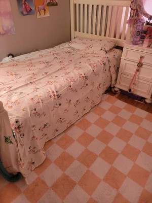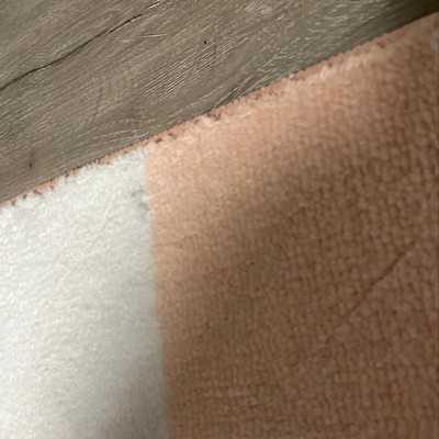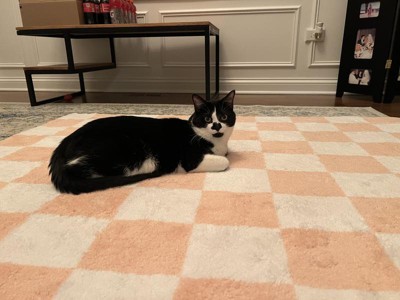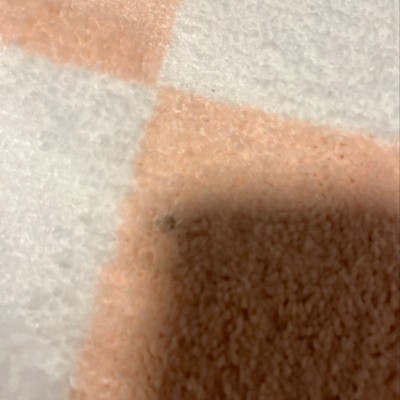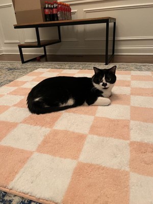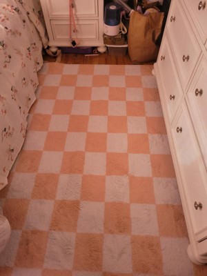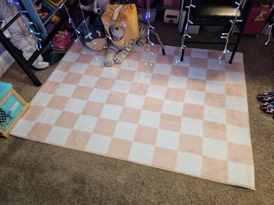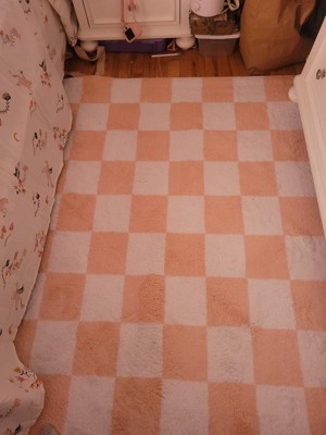 This pink and white checkered rug is very cute. The fibers are very soft and a little plushy. I wish the pink was a little more pink. It’s almost like an apricot/pink. But overall it’s a very nice rug.
