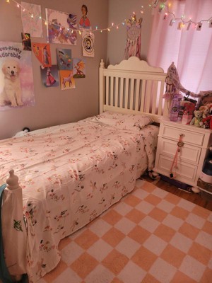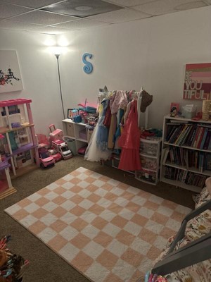 I love the checkered pattern of this rug. It’s a classic style perfect for a kids room. Note that the pink in this rug is more of a peachy pink. The rug is low profile so you can easily vacuum it. Great addition to my daughter’s bedroom.