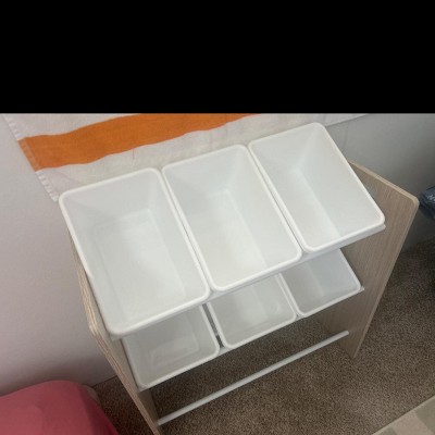 [This review was collected as part of a promotion.] This piece was a little difficult to build, but once it was done it looks pretty good. The color is very nice and looks well. The bins come out easily for little hands, but they also only fit a little bit of toys. Overall works great for our smaller children.